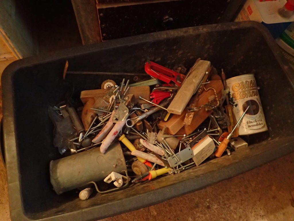 Neben endlosen Behältern voll teils rostiger Schrauben und Nägel fanden sich kiloweise stumpfe Feilen und Sägen in Regalen und Schubladen. Eine wahre Goldgrube für Altmetallhändler. Für uns war es nur Ballast. Erstaunlicherweise ist es möglich, gefühlt tausend verschiedene Schrauben zu horten ohne dass bei Bedarf die eine passende Variante dabei ist. Wir haben also irgendwann aufgegeben und alles entsorgt. Bleiben durften nur einige wenige sortierte Schraubensorten, die wir dann bei Bedarf auffüllen.