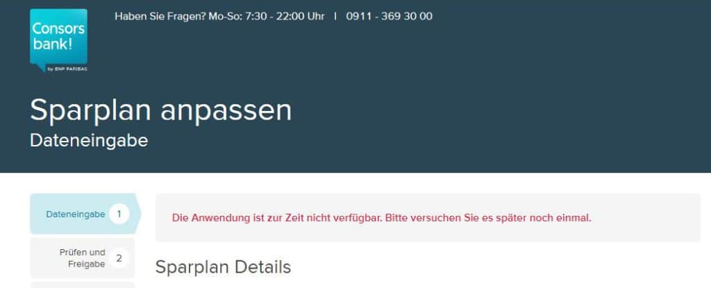 Die Bank hätte da natürlich überhaupt kein Thema mit, verdient sie sich doch eine goldene Nase damit. Aber mehr Zinsen und noch länger abbezahlen, das wollte ich unbedingt vermeiden. Also wurden die Sparpläne vorübergehend auf Eis gelegt, pausieren ist technisch ja kein Problem. Was allerdings ein großes technisches Problem war, war die Reaktivierung. „Die Anwendung ist zur Zeit nicht verfügbar. Bitte versuchen Sie es später noch einmal.“ Diese Meldung hatte ich über Tage in der Eingabemaske.