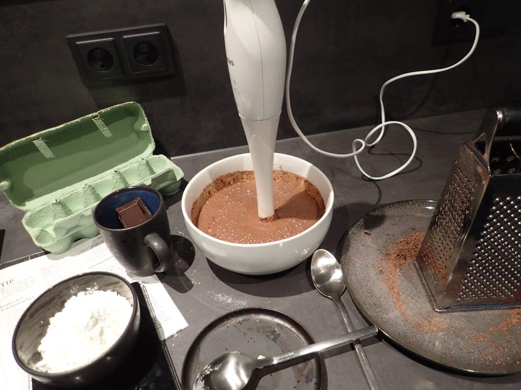 Mit Küchenmaschine kann man auch einfach alles auf einen Schlag reinwerfen und zusammenpanschen. Unsere ist nach drei Jahrzehnten von uns gegangen und ich vermisse sie nur bedingt. So ein Gerät nimmt mit all dem Zubehör einfach viel zu viel Platz ein und so oft brauche ich den elektrischen Support nicht. Allerdings musste ich auf die harte Tour lernen, warum in Rezepten eben nicht alles auf einmal zusammen in die Schüssel kommt – warme Butter und kalte Eier vertragen sich nicht so gut.