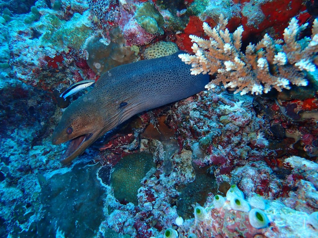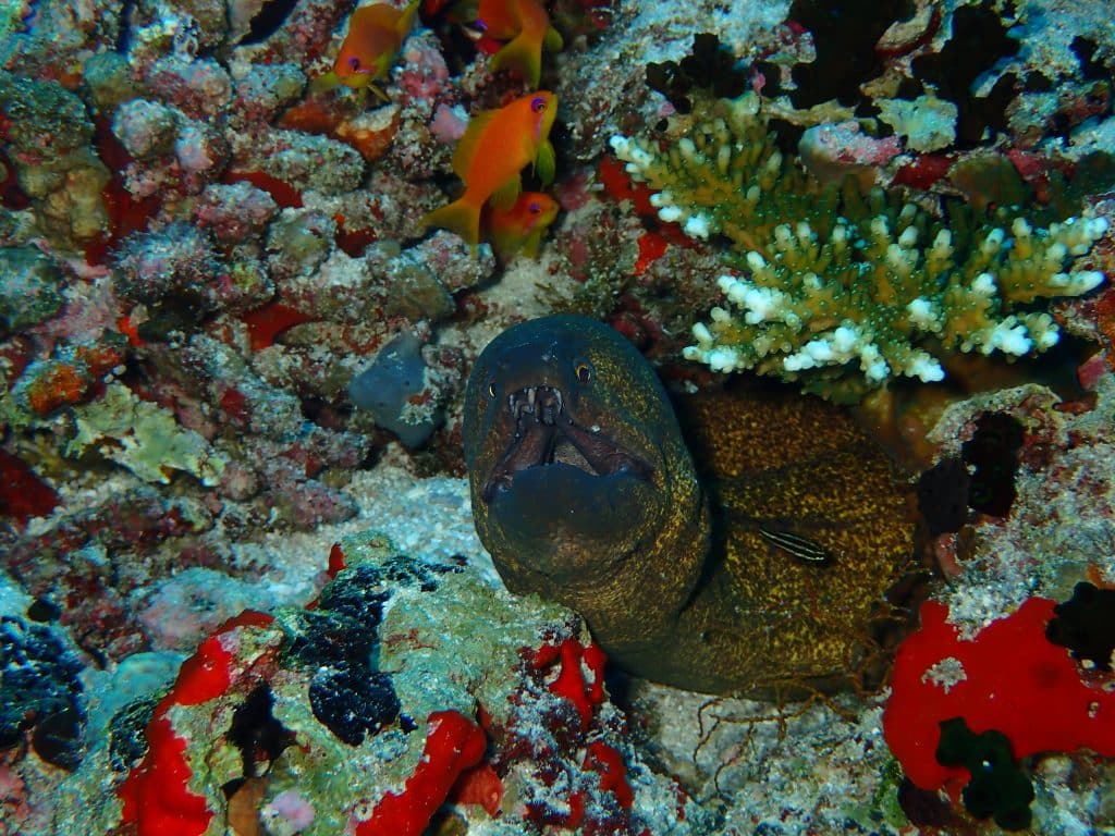 PS: Die Muräne auf dem Titelfoto ist übrigens keineswegs im Angriffsmodus. In dieser entspannten Position wartet sie auf den Einsatz der Putzerfische und -garnelen, die u.a. ihre Zähne reinigen.
