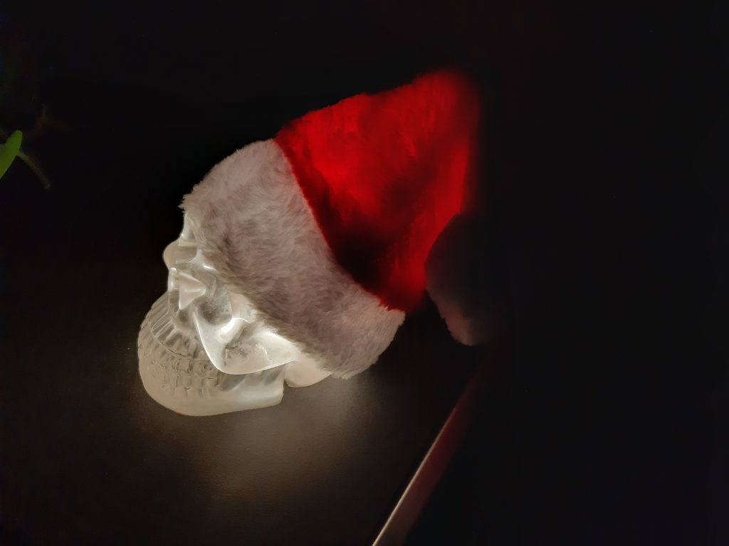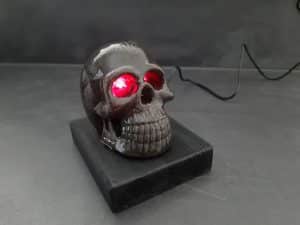 Als sich der Lieblingsnachbar dann einen Totenkopf mit rot leuchtenden Augen gewünscht hat, ist sogar mein Mann zum Bastler geworden. Da wird gebohrt und gelötet und das Ergebnis kann sich sehen lassen. Bzw. die Ergebnisse, denn so ein Kunstwerk weckt Begehrlichkeiten. Daher steht ein recht ähnliches Exemplar nun auch schon beim Schwager.