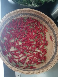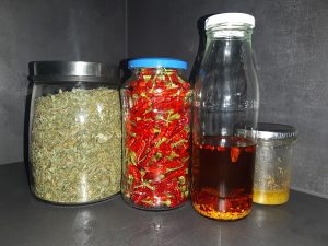 Aber ein bisschen stolz auf die eigene Ernte bin ich tatsächlich schon und es ist ein schönes Gefühl, im Supermarkt mit hochmütig erhobenem Haupt am Gewürzregal vorbei zu stolzieren. Auch die scharfen Soßen kann ich links liegen lassen, wir sind eingedeckt mit Chili-Öl, grüner Chilipaste und getrockneten Chilis und können wahrscheinlich demnächst Feuer spucken…Ich werde trotzdem versuchen, ein neues Chilipflänzchen aus den Samen zu ziehen. Ich muss ja schließlich üben.
