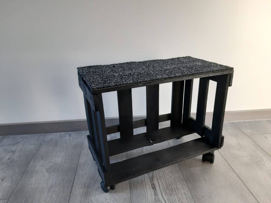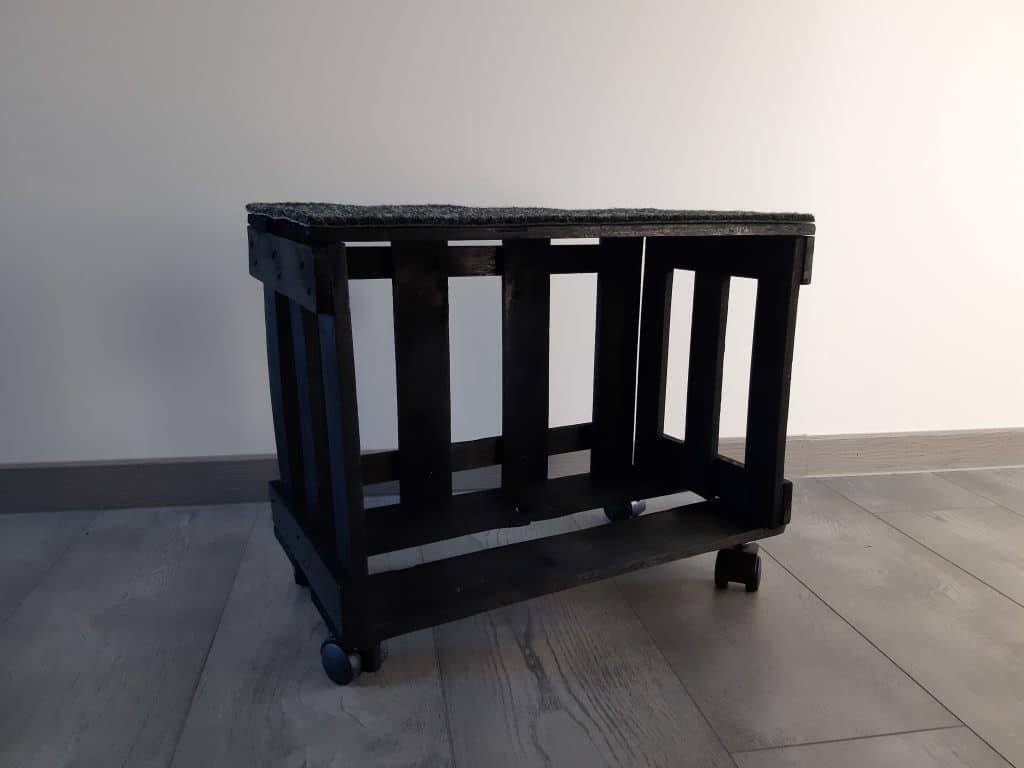 Mein letztes DIY-Projekt ist ein mobiler Fußschemel aus einer alten Weinkiste, die mich schon seit um die 30 Jahre durchs Leben begleitet. Ich muss zugeben, sie hat sich fast so gut gehalten, wie ich. Zwischenzeitlich schwarz lackiert, war auch hier der Lack ziemlich runter. Der wurde also grob runtergeschliffen, bevor ich das Holz mit schwarzer Beize neu eingefärbt habe. Ein paar Rollen (und etwa ein Kilo Unterlegscheiben aus dem Fundus) und ein Stück Teppich machen daraus ein vollwertiges Möbel.